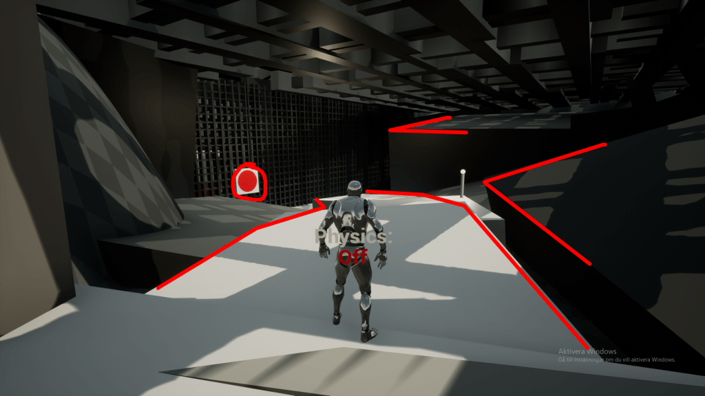 Here I used a path in different color to guide the player forward. As well as using a clear red for the button objective to draw the players eye. I also had some extra objects pointing towards the left, creating a sense of direction curving to the left in the whole room.